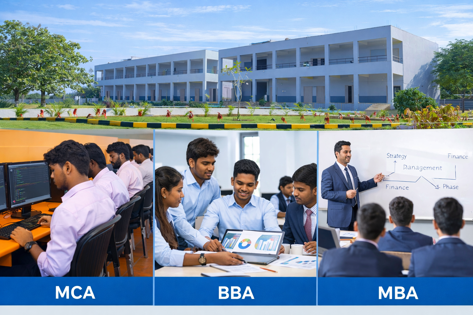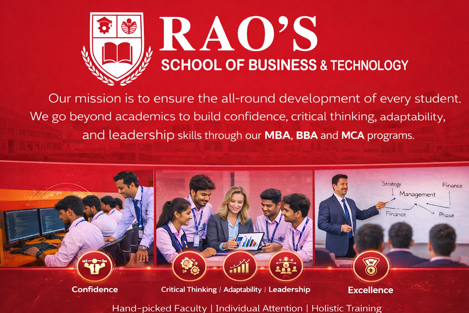 Rao's School of Business & Technology understands the fierce competition that defines today's dynamic global landscape — where businesses are being disrupted and technology is constantly evolving. With that reality in mind, we go beyond academics to train our students holistically across our MBA, BBA, and MCA programs, building their confidence, critical thinking, adaptability, and leadership so they are fully prepared to face the challenges and trials that await them beyond the boundaries of our campus.